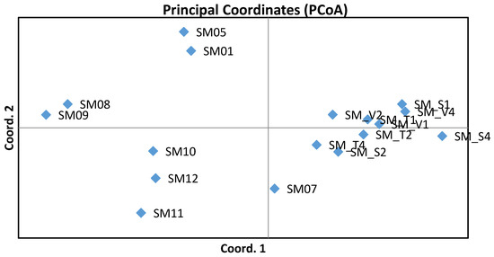 Estimates of differentiation expressed by FST values ranging from 0.006 to 0.027 indicated low genetic differentiation between units. Differentiations between the nine subpopulations from the gene conservation unit GZ 102 Trčkov–Šerlišský kotel–Vrchmezí showed lower values (0.006–0.011). FST values were greater than zero and so confirm the structuring of the studied Norway spruce units. After calculation of total FST based on 999 permutations, the overall level of genetic differentiation was found to be very low (0.011). Genetic distances between units were calculated based on Nei’s standard genetic distance [37]. The longest Nei’s genetic distance (0.168) appeared between the SM S4 (Orlické hory–Šerlich) and SM 08 (Českomoravská vrchovina) units. The closest Nei’s genetic distance (0.046) was between the SM S2 and SM T2 subpopulations, both from the Orlické hory locality. Values of Nei’s genetic distance among subpopulations of the gene conservation unit ranged from 0.046 to 0.092. The closest pairwise Nei’s genetic distance within other observed localities was 0.062 between SM 01 (Středočeská pahorkatina) and SM 05 (Středočeská pahorkatina), both of the Hurst ecotype. Nei’s standard genetic distances among the units are graphically illustrated in Figure 2, constructed on the basis of principal coordinate analysis, which shows the genetic similarity of the subpopulations from the gene conservation unit GZ 102 Trčkov–Šerlišský kotel–Vrchmezí. An interesting result was the grouping of the same ecotypes (Hurst, alpine, and mountain). The spatial differentiation was not confirmed by the STRUCTURE analysis. The Bayesian analysis identified K = 2 as the most relevant number of clusters. The admixture of clusters was very similar for studied Norway spruce units.