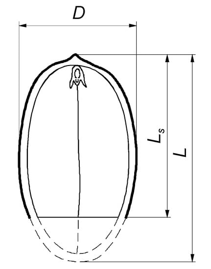 The length L, diameter D (Figure 1) and mass m of every acorn were determined, and acorns from one sample in each batch were scarified by reducing their length by one-quarter to one-third with the use of shears. Acorn health was evaluated visually, and only acorns without visible symptoms of pathological changes were used in the experiment. Rejected acorns were randomly replaced with new acorns whose geometric properties and mass were determined. The length Ls and mass ms of scarified acorns were measured.