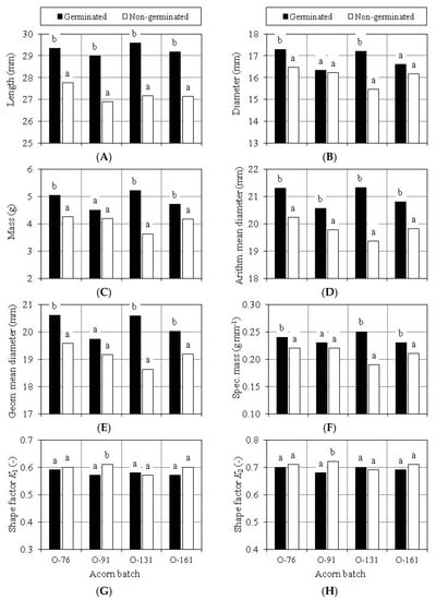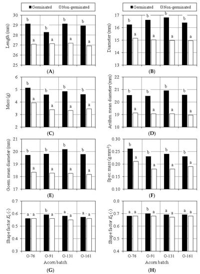 Significance of differences in the length (A), diameter (B), mass (C), arithmetic mean diameter (D), geometric mean diameter (E), specific mass (F), shape factor K1 (G) and shape factor K2 (H) of germinated and non-germinated complete acorns; a, b—different letters denote statistically significant differences.