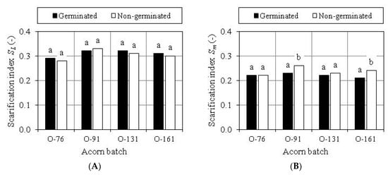 Significance of differences in the dimensional (A) and mass (B) scarification index of germinated and non-germinated acorns: a, b—different letters denote statistically significant differences.