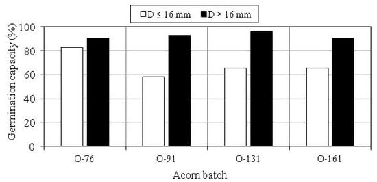 Similar relationships were noted when acorns were divided into two size groups based on their diameter (Figure 7). Germination capacity ranged from around 59% (batch O-91) to around 83% (batch O-76) in acorns measuring up to 16 mm in diameter, and it exceeded 90% in acorns with a diameter larger than 16 mm.