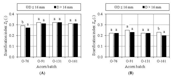 Significance of differences in the dimensional (A) and mass (B) scarification index of acorns measuring up to 16 mm and more than 16 mm in diameter: a, b—different letters denote statistically significant differences.