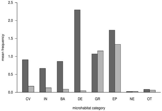 Mean frequency of occurring microhabitat categories on habitat trees (dark gray) and crop trees (light gray). Microhabitat categories: CV = cavities; IN = injuries and wounds; BA = bark pockets; DE = crown deadwood; GR = peculiarly growth form; EP = epiphytes; NE = nests; OT = others (e.g., resin flow).