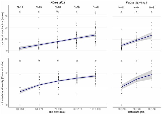 Number and diversity of microhabitats in habitat trees of the most frequent tree species Abies alba and Fagus sylvatica in relation to dbh classes. Different letters indicate significant differences between dbh classes. To facilitate the consideration of our findings in practical forestry, we used 20-cm-diameter classes instead of continuous dbh values.
