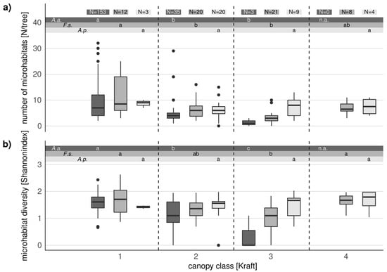 Relationship between tree canopy class and microhabitat frequency (a) and diversity (b) in habitat trees of the tree species Abies alba (A. a.), Acer pseudoplatanus (A. p.), and Fagus sylvatica (F. s.). Different letters indicate significant differences between canopy classes of each tree species. The black bar indicates the median, the box shows the interquartile range, and the whiskers the 1.5-interquartile range.