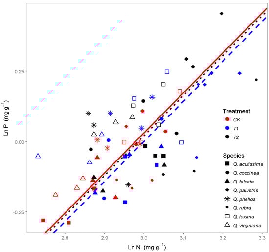 Relationships between leaf N and P concentrations for Quercus species under wind load. Ln N and Ln P: leaf N and P concentrations were transformed using the natural logarithm prior to analysis. CK: control, T1: about 4 m s−1 wind speed, T2: about 6 m s−1 wind speed. CK: y = 1.02x − 3.04, R2 = 0.56, p < 0.01; T1: y = 0.67x − 1.98, R2 = 0.35, p < 0.01; T2: y = 0.81x − 2.37, R2 = 0.217, p = 0.01. SMAs fitted among treatments did not show significant differences in slope (test for SMA (Standardized major axis) heterogeneity, 95% CIS (Confidence intervals), p = 0.26) and in intercept (p = 0.79).