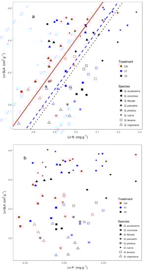 Relationships between leaf N, P concentrations and SLA (Specific leaf area) for Quercus species under wind load. Ln N, Ln P and Ln SLA: leaf N ,P concentrations and SLA were transformed using the natural logarithm prior to analysis. CK: control, T1: about 4 m s−1 wind speed, T2: about 6 m s−1 wind speed. (a) Leaf N concentration and SLA. CK: y = 1.78x − 0.99, R2 = 0.17, p = 0.04; T1: y = 2.06x − 2.01, R2 = 0.33, p < 0.01; T2: y = 1.83x − 1.41, R2 = 0.18, p = 0.04. SMAs fitted among treatments did not show significant differences in slope (p = 0.96), but apparent in intercept (p < 0.01); (b) Leaf P concentration and SLA.