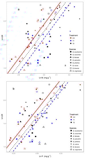 Relationships between leaf N, P concentrations and LDI (Leaf dissection index) for Quercus species under wind load. Ln N, Ln P and Ln LDI: leaf N ,P concentrations and LDI were transformed using the natural logarithm prior to analysis. CK: control, T1: about 4 m s−1 wind speed, T2: about 6 m s−1 wind speed. (a) Leaf N concentration and LDI. CK: y = 1.19x − 1.58, R2 = 0.41, p < 0.01; T1: y = 0.83x − 0.67, R2 = 0.45, p < 0.01; T2: y = 0.78x − 0.44, R2 = 0.23, p = 0.02. SMAs fitted among treatments did not show significant differences in slope (p = 0.55), but apparent in intercept (p < 0.01); (b) Leaf P concentration and LDI. CK: y = 0.90x + 1.95, R2 = 0.436, p < 0.01; T1: y = 0.73x + 1.83, R2 = 0.43, p < 0.01; T2: y = 0.48x + 1.89, R2 = 0.22, p = 0.02. SMAs fitted among treatments did not show significant differences in slope (p = 0.83), but apparent in intercept (p = 0.03).