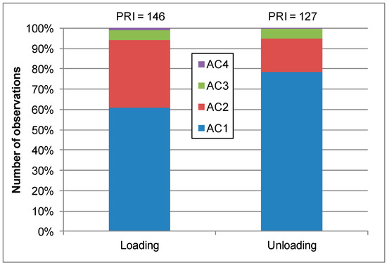 The mean postural risk index for post debarking was 136, or 146 and 129 for the loading and unloading station, respectively. Loading incurred a higher postural risk than unloading, with twice as many observations in the AC2 class, compared with the general distribution (Figure 2). This distribution “anomaly” offered the largest contribution (70%) to the overall χ2 score for the comparison of distributions, which was highly significant (p < 0.001).