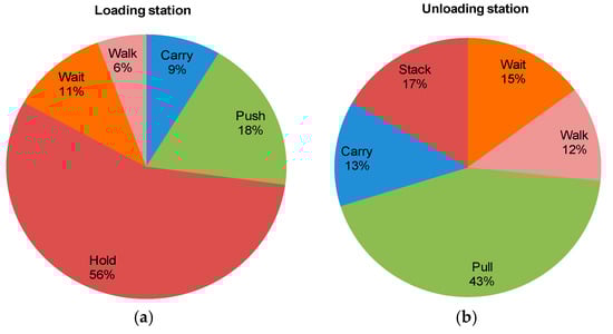 Percentage breakdown of observations among different tasks, by work station, (a) loading station, (b) unloading station.