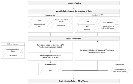 Second, we made an empirical model that can determine the relationship between ozone concentration or climate change and the net primary productivity of forests. The model for estimating the net primary productivity can be divided into three categories: remote sensing-based models [38], correlative (biogeographical) models or process-based (biogeochemical) models, and empirical models [39]. The purpose of this study is to predict future forest productivity based on current net primary productivity of forest and to understand how ozone affects current and future forest productivity. However, most of the aforementioned models do not reflect the effects of ozone, and even if the effects of ozone are reflected, there are limitations to the construction of the input data for estimating future forest productivity. Therefore, in this study, a statistical model was developed using the variables that affect the net primary productivity of forests [40]. The empirical model estimates forest productivity based on factors, such as evapotranspiration, stand age, Normal Distribution Vegetation Index (NDVI), and other factors based on temperature and precipitation. However, the disadvantage of the empirical model is that there is a limit to the assumption that changes in forests occur immediately in response to climate change [38]. Nevertheless, the empirical model has a simple structure and can be used as a basis for the calculation of net production [41]. A vector autoregressive model and panel analysis model were used to estimate and predict NDVI and net primary productivity.