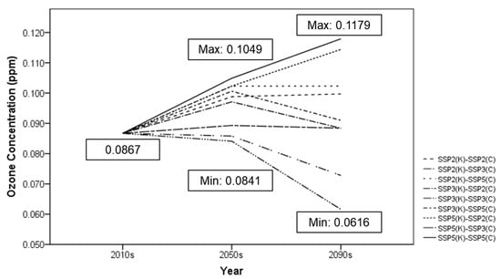 Thus, future ozone concentration changes due to NOx emissions from various scenario combinations are expected to decrease by up to 3% (0.0420 ppm) or increase by up to 21% (0.0512 ppm) when compared to their current levels in the 2050s and a change between −29% (0.0308 ppm) to +36% (0.0572 ppm) is expected in the 2090s, as seen in Figure 2.