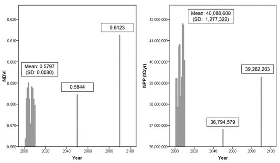 The NDVI and the net primary productivity of forests estimates derived from the results are shown in Figure 3. Figure 3 shows the annual mean value of NDVI, the net primary productivity of forests used as input data, and the 10-year mean value in the future. The values of NDVI were about 0.58~0.61 and were within the range of the NDVI value of forest [74]. The values of NDVI in this study are similar to the values that are found in other studies [75]. The net primary productivity of forests for the last decade was about 630–696 tC/km2/year, and the average NPP for the last 10 years was about 663 tC/km2/year (SD: 21 tC/km2/year). The average value of the total NPP of Korea is about 40 million tC/year. The year 2003 had the lowest NPP, at about 38 million tC/year, and the highest NPP value was about 42 million tC/year in 2009. The independent variables in 2003 showed that precipitation, NDVI, and temperature range were higher than in other years, but solar radiation was notably low. The low productivity in 2003 was due to this comparatively lower solar radiation. In addition, the NPP of forests was the highest in 2009 because of that year’s comparatively higher amount of solar radiation; precipitation and NDVI values were similar to those of other years, but the highest level of radiation was observed in 2009. Based on all of the available information, we concluded that the distribution of these input variables affected the results. Furthermore, both NPP and NDVI are expected to decrease in the 2050s, when compared to their current levels, and they are expected to increase in the 2090s compared to their 2050s levels. However, NDVI increases compared to its present level in the 2090s, but NPP is expected to decrease compared to its current level during the same period. This implies that NDVI estimation is related to variables such as temperature and precipitation, but it can be assumed that the change in ozone concentration influenced NPP estimation. However, the empirical model has a disadvantage in that it can be only applied to the region for model developing [76], and there is a limitation that the actual technology is reflected [41,77].