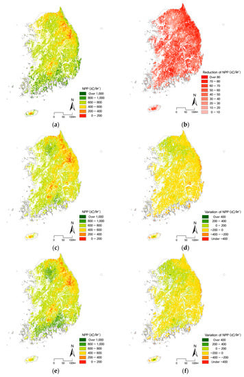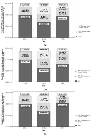 Ten-year average of total net primary productivity of forests in Korea: (a) The net primary productivity with fixed ozone concentration; (b) The net primary productivity when ozone concentration increases to its maximum potential level; and, (c) The net primary productivity when ozone concentration decreases to its minimum potential level.