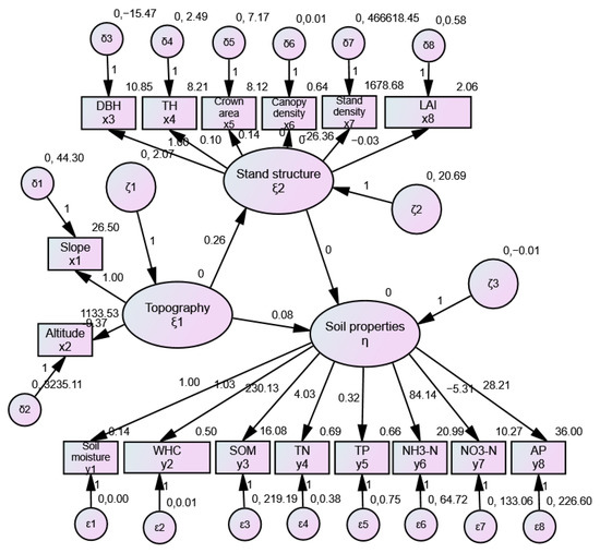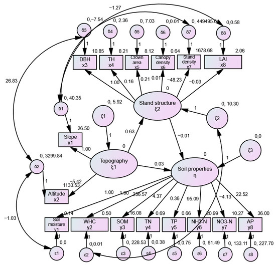 The concept of SEM has been applied to many multivariable coupling studies in the natural sciences and has achieved good results in forest ecology studies. Application studies in forests [12,14,42,43], shrublands [13], wetlands [35], and other ecosystems [15] have proved the scientific basis and reliability of the model. Its importance is that it allows for the detection of topographic, stand structural, and soil characteristic factors that are responsible for structural and functional changes. However, the correct interpretation of these models requires a strong supply of ecological data and a good understanding of the characteristics of the topography–stand–soil system.