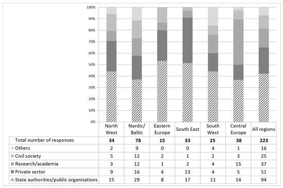 Number of received responses (N = 223) distributed according to actor groups and European regions.