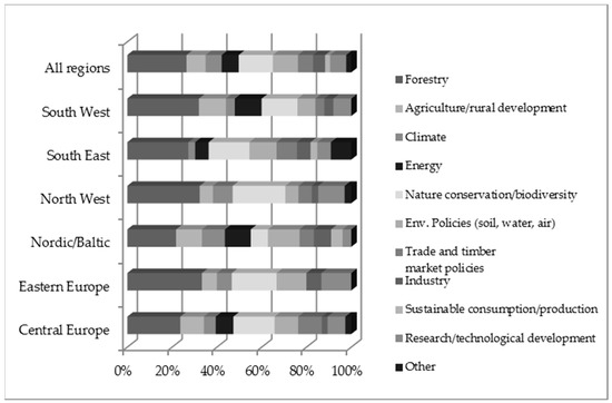 In regard to the policy areas, a majority of the respondents primarily worked in the area of forestry (ca. 30% for all of the European regions), whereas nature conservation/biodiversity (ca. 18% for all regions) was the second most common policy area of work (Figure 2).