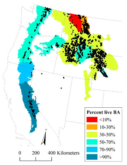 Locations of 1406 forest inventory plots (black dots) with live or dead whitebark pines in the western US, with percentage of standing whitebark pine trees ≥2.54 cm diameter at breast height that are alive within each eco-province (aggregated from the ecological subsections of Cleland et al. 2007 [19]), based on plots measured between 2007 and 2016. Provinces in the central Great Basin are not shown due to small sample size. Plot locations are approximate.