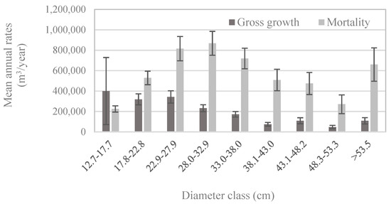 Population estimates of the mean annual volume of gross growth and mortality of whitebark pine trees by diameter class, based on trees measured between 2005 and 2015 (n = 404 plots; measurement years vary by state) among all forest types. Error bars represent +/− one standard error [20].
