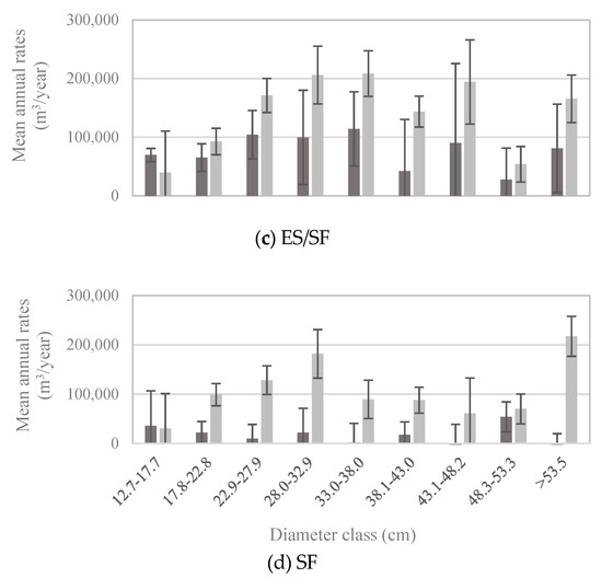 Mean annual volume of gross growth (dark bars) and mortality (light bars) of whitebark pine trees by diameter class, based on trees measured between 2005 and 2015 (n = 341 plots; measurement years vary by state) within (a) the whitebark pine forest type (WP; n = 107 plots), (b) the lodgepole pine forest type (LP; n = 87 plots), (c) the Engelmann spruce/subalpine fir forest type (ES/SF; n = 77 plots), and (d) the subalpine fir forest type (SF; n = 70 plots). Note different scales of y-axes. Error bars represent +/− one standard error [20].