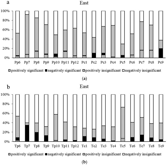Chronologies in the west tended to show more significant correlation with climate factors than those in the east. More than twenty percent of chronologies in the west showed significant correlation with the total monthly precipitation of the previous August (32.3%), the previous September (21.3%), the current May (29.6%) and the current June (52.2%) (Figure 5c). Those in the west also showed significant correlation with the mean monthly temperature of the previous June (30.9%), the previous July (55.2%), the current June (52.6%) and the current July (50.0%) (Figure 5d).