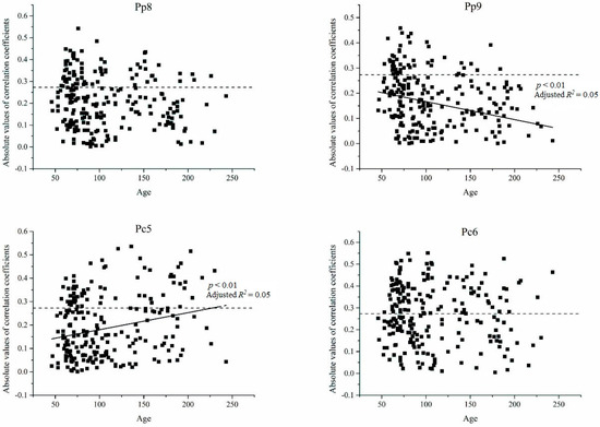 Relationships between age and radial growth’s correlation coefficients with climate in the east. P indicates total monthly precipitation; T indicates mean monthly temperature; p represents months of the previous year; and c represents months of the current year. The dashed lines indicate a significance level of 0.05.
