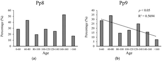 In the west, the ages of trees showed significant linear relationships with correlation coefficients between radial growth and the total monthly precipitation of the previous August and September and the current May and June (Table S2). Younger trees showed a stronger positive correlation with the total precipitation of the previous September, while older trees tended to have a stronger positive correlation with that of the current May (Figure 8). Forty-three-point-four percent of cores from 60–80-year-old trees and 52.6% of cores from 140–160-year-old tress showed significantly positive correlations with the total precipitation of the previous August. Thirty-four-point-two percent of cores from 60–80-year-old trees showed significantly positive correlations with the total precipitation of the previous September. Fifty-three-point-eight percent and 46.2% of cores from 140–160-year-old trees showed significantly positive correlations with total precipitation of the current May and June, respectively, and this percentage was the highest compared with the scores of other age groups (Figure 9).