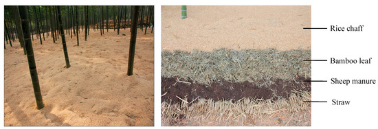 The moso bamboo forest used for the experiment was a pure forest with a concentrated slice. The production of bamboo shoots was the major strategy, whereas the harvest of bamboo timber was the minor strategy. In order to improve the production of bamboo shoots and maximize economic benefits, intensive managements, such as fertilization and mulching with organic matters, had been conducted in moso bamboo forests since 2013. Approximately 750 kg·ha−1 of compound fertilizer were applied in June combined with tilling, and 1500 kg·ha−1 of this fertilizer were applied in September for the cultivation of shoots [16]. The mulching time was mid- to late November. Specifically (Figure 1), first, organic fertilizers (sheep manure, 60,000 kg·ha−1) were applied before mulching. Second, 10 cm of straw were placed to cover the bottom. Then, 300,000 kg·ha−1 of water and 20,000 kg·ha−1 of sheep manure were added to accelerate the fermentation of the straw. Finally, 20 cm of bamboo leaves were placed on the sheep manure, and 20 cm of rice chaff were mulched on the top as the insulating layer. The organic mulches were gradually removed when natural shoots sprouted. Continuous mulching management was conducted in the experimental forests, and bamboo forests with different mulching years were established, which created better conditions for this study.