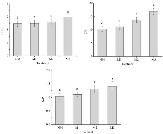 As shown in Figure 2, there was a gradually increasing trend of C/N, C/P and N/P with the increase of mulching years, and no significant differences between NM and M1 were found (p > 0.05). C/N and C/P in M3 were significantly higher than those in M2 (p < 0.05), while there was no significant difference in N/P between M2 and M3 (p > 0.05).