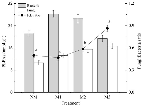 Figure 3 shows the difference between the bacteria and fungi biomass in each treatment and the fungi:bacteria PLFA ratio. With the increase of mulching years, total bacteria PLFAs increased first and then decreased, while total fungi PLFAs continued to increase. The fungi:bacteria PLFA ratio decreased first and then increased with the increase of mulching years, and no obvious difference was observed between NM and M1 (p > 0.05).