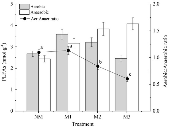 Figure 4 shows the difference between the aerobic bacteria and anaerobic bacteria biomass in each treatment and the aerobic:anaerobic PLFA ratio. With the increase of mulching years, aerobic bacteria PLFAs increased first and then decreased, while anaerobic bacteria PLFAs continued to increase. The aerobic:anaerobic PLFA ratio increased first and then decreased with the increase of mulching years, and no significant differences between NM and M1 were found (p > 0.05).