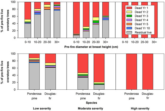 Live overstory density varied with fire severity, time since fire, and fire severity × time since fire, indicating that the severity classes experienced different temporal density patterns (Figure 2). Before the Hayman Fire, live overstory density averaged 572 stems ha−1 across all 20 plots, with no differences among fire severity classes. Trees were generally more abundant in the smaller than the larger size classes pre-fire, with 34% of trees in the 0–10 cm DBH class, 25% in the 10–20 cm DBH class, 24% in the 20–30 cm DBH class, and 17% in the 30+ cm DBH class. Ponderosa pine constituted 61% of pre-fire trees and Douglas-fir constituted 36%. Live overstory density in low-severity plots decreased 21% in post-fire year one, to an average of 371 stems ha−1. In post-fire year two, density in low-severity plots decreased an additional 5% due to delayed tree mortality. Density continued to decrease non-significantly thereafter, such that by post-fire year ten, it had been reduced by a total of 34%, to an average of 308 stems ha−1. Trees with the smallest DBHs experienced the greatest overall mortality, with 60% of 0–10 cm DBH trees killed, 35% of 10–20 cm DBH trees killed, 21% of 20–30 DBH trees killed, and 24% of 30+ cm DBH trees killed (Figure 3). Moreover, Douglas-fir experienced greater overall mortality than ponderosa pine, with 39% of the former and 25% of the latter killed. Meanwhile, the post-fire year one decrease in live overstory density was more substantial in moderate-severity plots; in these plots, density dropped 68%, to an average of 260 stems ha−1. Density decreased an additional 5% in post-fire year two and 2% in post-fire year three. By the time a decade had passed since the Hayman Fire, mean live overstory density in moderate-severity plots averaged 177 stems ha−1, 79% lower than pre-fire. Overall, 93% of trees in the 0–10 cm DBH class were dead, while 82% of trees in the 10–20 cm DBH class, 63% of trees in the 20–30 cm DBH class, and 50% of the trees in the 30+ cm DBH class were dead. Overall mortality was 86% for Douglas-fir and 66% for ponderosa pine. In high-severity plots, all pre-fire live trees were dead in the first post-fire year.