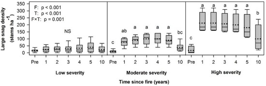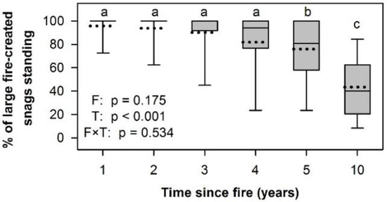 Persistence of large (>20 cm diameter at breast height (DBH)) fire-created snags with respect to time since fire. Boxes represent 25th, 50th, and 75th percentiles, whiskers represent 10th and 90th percentiles, and dotted lines represent means. The p-values are model results for the effects of fire severity (F), time since fire (T), and their interaction (F × T). Letters separate means though time.