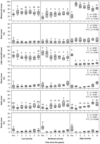 Mineral soil, rock, litter and duff, wood, herb, and shrub cover (top to bottom) with respect to fire severity and time since fire. Boxes represent 25th, 50th, and 75th percentiles, whiskers represent 10th and 90th percentiles, and dotted lines represent means. The p-values are model results for the effects of fire severity (F), time since fire (T), and their interaction (F × T). For attributes where F × T was significant, letters separate means though time within severity classes.