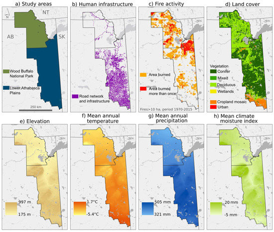 Maps showing (a) the location of the areas of interest (53.63° N, 110° W, 60.70° N, 115.60° W): Wood Buffalo National Park, which occupies a portion of Alberta (AB) and Northwest Territories (NT), and Lower Athabasca Plains, which borders with the province of Saskatchewan (SK), (b) Human infrastructure cover (30-metre-resolution, Landsat; [34]), (c) Area burned from 1970–2015 (one-kilometer resolution), (d) Land cover (Global Land Cover Characterization Project, one-kilometer resolution, AVHRR; [35]), (e) Elevation, (f) Mean annual temperature, (g) Mean annual precipitation, and (h) Mean climate moisture index (precipitation minus potential evapotranspiration, mm, 1° latitude by 1° longitude resolution; [36]).