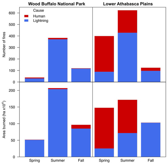 Fire management also differs between these regions. Fires in WBNP are not actively suppressed unless they pose an imminent threat to infrastructure within the park or neighbouring communities, leaving wildfires to fulfill their “natural” role. In contrast, LAP includes the community of Fort McMurray and most of the Lac La Biche Alberta Wildfire Management areas, where there is a strict policy to suppress and prevent fires. On average, during the period 1970–2015, lightning-caused fires in WBNP are larger than the ones in LAP (Table A1), whereas anthropogenic ones are larger in LAP. Human contribution to area burned is so prominent in LAP that the area burned by human-caused fires exceeds the area burned by lightning-caused fires in this region (Table A1). Summer is the season with the highest fire activity (number of fires and area burned; Figure 2) in both regions, but the human contribution to fires is considerably higher during the spring in LAP than in WBNP.