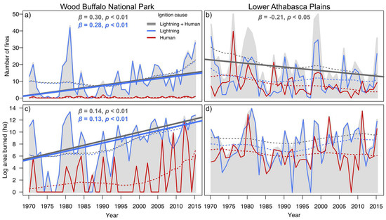 We obtained the historical fire records from the Canadian National Fire Database [37] from which we derived the number of fires and area burned (ha) during the fire season (1 March to 31 October) [38] for the period 1970–2015. Although the database extends earlier than 1970, the analysis was limited to this time period because the data recording and methods of detection during the contemporary era were more reliable and consistent than those of the earlier period [24,27,39]. In addition, we only included fires ≥10 ha because they are less likely to go undetected or unreported than fires <10 ha. The fires were stratified by area (WBNP or LAP) and by cause (human or lightning) and summarized into annual time series using the total number of fires and total area burned (log transformed) during the fire season.