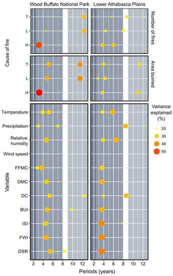 Fire activity in WBNP was characterized by longer and more acute periodicities than the ones found in LAP. We observed that the number of fires and area burned by lightning in WBNP showed strong activity peaks every ~12 years, whereas in LAP, weaker oscillations (i.e., under eight years) were most frequent. Anthropogenic ignitions in both areas mostly displayed high frequency (short periods) oscillations (~3–6 years); however, area burned by humans also showed strong oscillations every ~11 years (Figure 4).