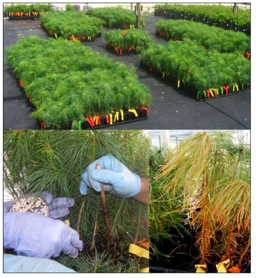 Today, Fraser fir (Abies fraseri (Pursh) Poir.) is the most popular Christmas tree species grown in the southern Appalachians, where revenue from annual sales exceed $US 100 million in North Carolina alone [7]. However, Fraser fir is highly susceptible to root rot disease caused primarily by Phytophthora cinnamomi Rands, an introduced soil-borne pathogen with an extensive host range [8,9,10]. Resistance to this pathogen has not been found in Fraser fir and chemical methods of control are stop-gap at best [11,12]. Because P. cinnamomi can persist in soil for decades, infested sites are often removed from Fraser fir production. Faced with this reality, growers commonly plant Eastern white pine on infested sites where Fraser fir cannot survive. This strategy is mostly successful, the exceptions being extremely high disease hazard areas (i.e., sites with extremely poor drainage and high inoculum load) [13]. Kirby and Grand 1975 [14] demonstrated that P. cinnamomi is pathogenic to Eastern white pine. Infected seedlings showed stunting of new growth, chlorosis, necrosis, needle loss, and severe root rot. On lower Piedmont and Coastal Plain sites, especially where Eastern white pine is planted outside its natural range, it is more sensitive to Phytophthora root rot and recently an increase in disease has occurred on Christmas tree farms in this region. Annual losses of $US 15 million to the littleleaf disease complex of southern pines [15] and $US 9 million to root rot disease in Fraser fir [16], both also caused by P. cinnamomi, underscore the concern over potential losses in Eastern white pine Christmas tree and forest plantations.