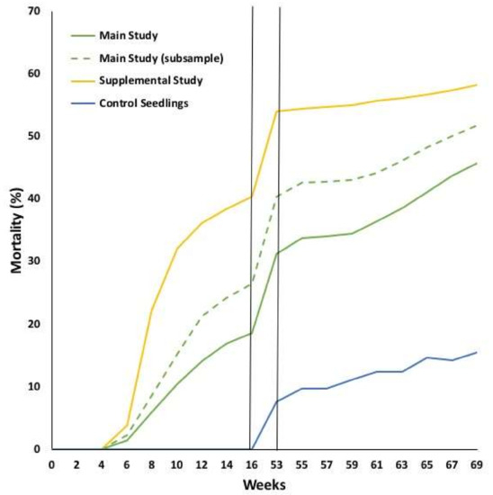 Mortality (%) of Eastern white pine seedlings inoculated with Phytophthora cinnamomi at weeks 0, 8, 53, and 61. Seedlings in the Main Study were inoculated with a culture isolated from Fraser fir while seedlings in the Supplemental Study were inoculated with a culture isolated from Eastern white pine. The Main Study (subsample) represents the 20 open-pollinated families in common with the Supplemental Study. The Control Seedlings were not inoculated.