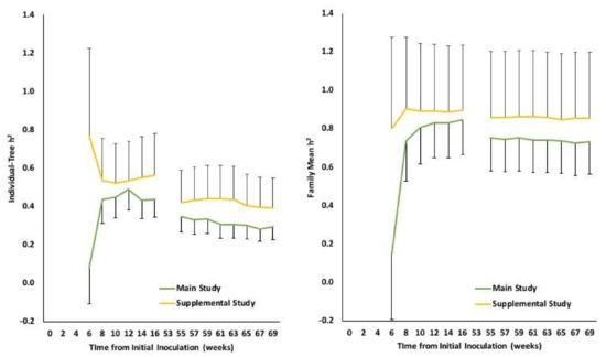 Individual-tree (left) and family mean (right) heritability estimates (with std. error) for mortality of Eastern white pine seedlings inoculated with Phytophthora cinnamomi at weeks 0, 8, 53, and 61. Seedlings in the Main Study were inoculated with a culture isolated from Fraser fir while seedlings in the Supplemental Study were inoculated with a culture isolated from Eastern white pine.