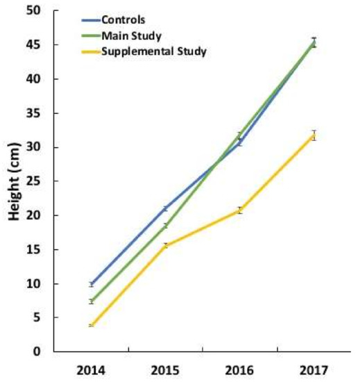 The initial height (2014) of the sub-sample of seedlings from six families that remained non-symptomatic throughout the study was statistically different among the main study, supplemental study, and control group (Figure 4). During the subsequent three years, the height of the control seedlings and those in the main study were not statistically significant from each other. The height of the non-symptomatic seedlings in the supplemental study was initially the lowest of the three groups and this statistically significant difference widened over the measurement period (Figure 4).