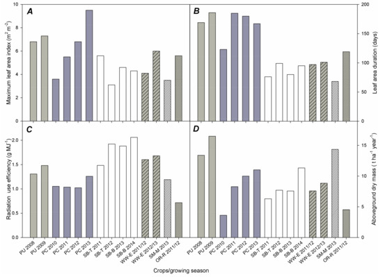 Comparison of (A) the maximum leaf area index (LAImax, m2 m−2); (B) the leaf area duration (LAD, days); (C) the radiation use efficiency (RUE, g MJ−1); and (D) the aboveground dry mass (AGDM, t ha−1 year−1) in SRC poplar clone J-105 uncoppiced (PU) from 2008–2009 and coppiced (PC) from 2010–2013 and AFCs (spring barley cultivar Tolar (SB-T) from 2011–2012 and cultivar Bojos (SB-B) from 2013–2014, winter wheat cultivar Etela (WW-E) from 2011/2012–2012/2013, silage maize cultivar MON3301 (SM-M) in 2013, and oilseed rape cultivar Rohan (OR-R) in 2011/2012).
