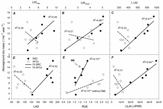 The relationships between aboveground dry mass (AGDM) production and: (A) the maximum leaf area index (LAImax); (B) the mean LAI (LAImean); (C) the sum of LAI (∑LAI); (D) the leaf area duration (LAD); (E) the radiation use efficiency (RUE); and (F) ∑(LAI × IPAR) (absorbed photosynthetically active radiation) in SRC poplar clone J-105 and AFCs, respectively. Note: ** significant Pearson correlation coefficients at 0.05.