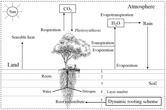 As the vertically resolved soil mineral N is not predicted in CLM4.5, the total N (TN) data from the Global Soil Dataset for Earth System Modeling [35] that had vertical layers consistent with CLM4.5 were used to represent soil mineral N content [28]. Although this data was time invariant, more effort should be made to resolve the original CLM4.5 TN in order to produce vertically layered data in the future. The dynamic rooting scheme influences climate modeling in CESM1.2.0 in multiple ways. The varying root distribution has a direct impact on βt, which affects photosynthesis and stomatal conductance. Moreover, the varying root fraction influences the effective root fraction, which affects the amount of water extracted from each layer. The aforementioned factors will ultimately influence land–atmosphere exchange processes, such as transpiration, and through these will affect latent heat, gross primary production, and the global climate. Figure 1 shows in detail the impacts of the dynamic rooting scheme on land–atmosphere interactions.