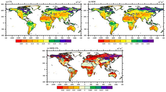 Annual soil moisture (SM, m3 m−3) over 1982–2005 for (a) the original CESM1.2.0 (CTL) run; (b) the CESM1.2.0_DR coupled with the dynamic rooting scheme (NEW) run; (c) the difference between NEW and CTL. (Grid shaded regions are significant at the 95% confidence level according to Student’s t-test.).