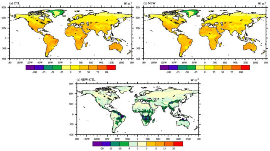 Annual sensible heat (SH, W m−2) over 1982–2005 for (a) the CTL run; (b) the NEW run; (c) the difference between NEW and CTL. (Grid shaded regions are significant at the 95% confidence level according to Student’s t-test.).