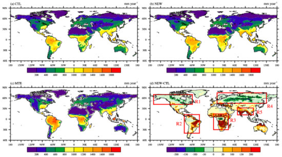 Annual evapotranspiration (ET, mm year−1) over 1982–2005 for (a) the CTL run; (b) the NEW run; (c) Model Tree Ensembles (MTE); (d) the difference between NEW and CTL. (Grid shaded regions are significant at the 95% confidence level according to Student’s t-test, and the red frames outline typical regions with significant differences, denoted as R1, R2, R3, R4, and R5.).