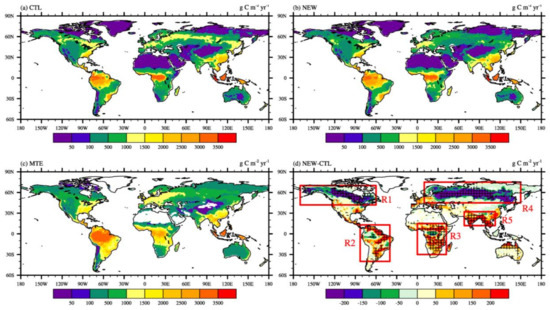 Annual gross primary production (GPP, g C m−2 year−1) over 1982–2005 for: (a) the CTL run; (b) the NEW run; (c) MTE; (d) the difference between NEW and CTL. (Grid shaded regions are significant at the 95% confidence level according to Student’s t-test, and red frames outline grouped regions with significant differences, denoted as R1, R2, R3, R4, and R5.).