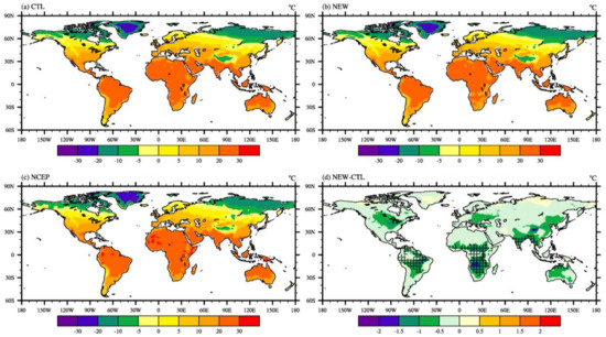 Twenty-four-year (1982–2005) mean 2-m air temperature (TA, °C) from (a) the CTL run; (b) the NEW run; (c) NCEP data; (d) the difference between NEW and CTL. (Grid shaded regions are significant at the 95% confidence level according to Student’s t-test.).